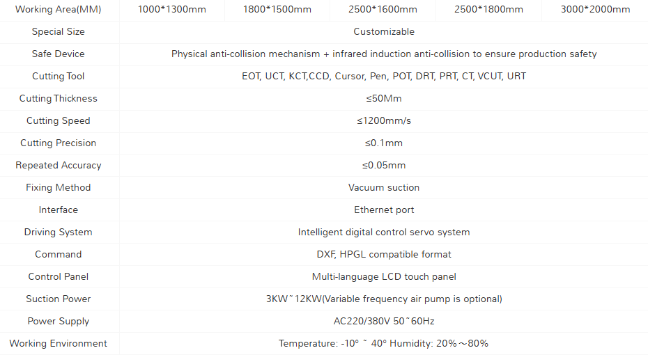 The CNC cardboard cutting machine features an infrared sensing system for 360° operator safety and a precise camera positioning system to support various mark types, improving work efficiency. Its sturdy aluminum honeycomb platform provides strong suction and remains flat even after prolonged use. The flexible tooling system accommodates a wide range of tools, while the efficient anti-drying and rolling feeding system completes material feeding and cutting in just 5 seconds, enabling continuous operation. Powerful CAD editing and design software integrates seamlessly with CorelDraw, Adobe Illustrator, Onyx, Caldera, PrintFactory, and MainTop, and supports barcode reading to prevent errors and boost productivity. The parameter formulation system adjusts cutting settings for different materials to ensure precision, while the overall frame is designed for stability, simplicity, and portability. The accurate tool setting system allows precise knife depth control and extends mat life. A scientifically organized wiring and chassis layout ensures stable and safe operation, supports future upgrades, and makes installation and maintenance easy.