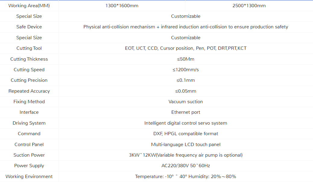 This flatbed digital cutting machine combines high-speed precision with versatile functionality, featuring an automatic nesting system for efficient layout, a 7-inch touch screen for easy operation, a conveyor table supporting continuous and ultra-long cutting, a 360° infrared sensing system for operator safety, a high-quality suction table for stable flatness, and imported servo motors with linear guides for long-lasting precision. It is ideal for a wide range of applications, including transforming rigid materials like acrylic, PVC, foam board, and corrugated plastic into signs, POS displays, and custom letters; producing short-run, high-value packaging and prototypes; cutting textiles, leather, and composites for apparel and technical materials; processing automotive interiors such as synthetic leather, carpeting, and non-woven fabrics; and supporting general contract manufacturing with versatility across gaskets, insulating materials, and various plastics, making it a highly adaptable solution for diverse industries.